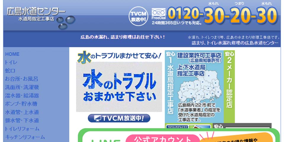 広島水道センターは広島県内でトイレ・蛇口の水漏れ、つまりを24時間365日緊急修理対応する水道局指定工事店